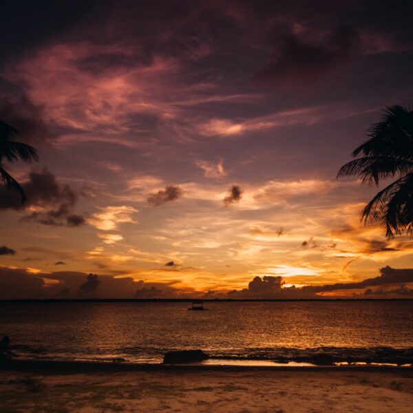 two palm trees on a beach in Haiti with a boat sitting on the sand in the background and a beach pier in the distance set against a blue sky with fluffy white clouds.